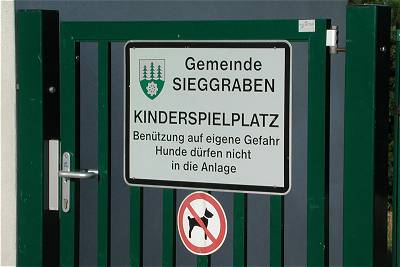 (1) Eingang Gut gesicherter Spielplatz mit Zaun und Eingangstüren, außerdem fällt das Hundeverbot am Spielplatz positiv auf. |