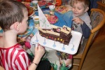 Neben einer Piratenschifftorte gab es noch Piratenspiele und natürlich waren alle Piraten auch entsprechend gekleidet. Schlußendlich galt es dann auch noch einen Schatz zu finden. Quer durch das Haus führten die versteckten Hinweiszettel. So waren wir sowohl in der Küche als auch im Badezimmer. Gut, dass unter den Piraten auch ein Schüler war, der die Hinweiszettel lesen konnte. Am Ende fanden wir den Schatz im Arbeitszimmer.